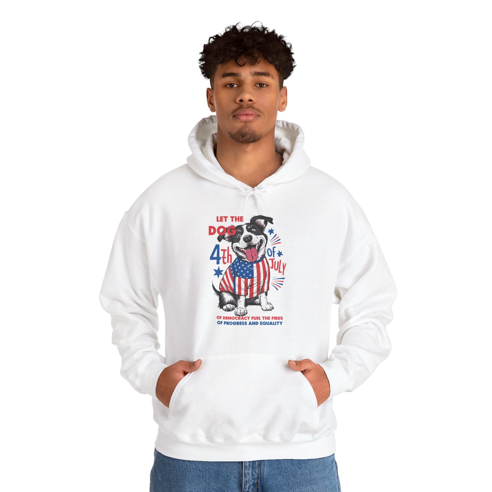 Celebrate the Fourth of July with this adorable and patriotic unisex hoodie! Featuring a happy dog dressed in a festive American flag shirt, this design is perfect for dog lovers and anyone who wants to show their patriotic spirit. The text, "Let the Dog of July of democracy fuel the fires of progress and equality," adds a meaningful touch to the fun design. This hoodie is cozy, comfortable, and an ideal piece for your Independence Day celebrations, fireworks, or just a day out with your best friend. It also makes a great gift for any dog owner who loves America!