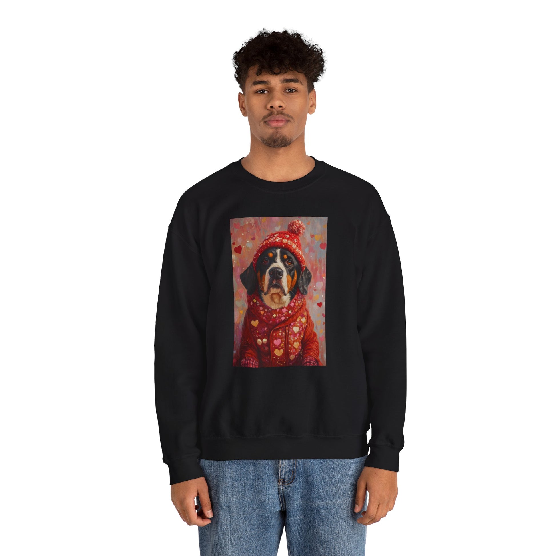 Embrace the season of love and warmth with this beautiful unisex sweatshirt! It features an artistic portrait of a majestic dog, resembling a Bernese Mountain Dog or similar gentle giant, bundled up in a sweet red knit sweater and beanie covered in little hearts. The background is soft and dreamy, making it look like a piece of high-quality, expressive artwork.