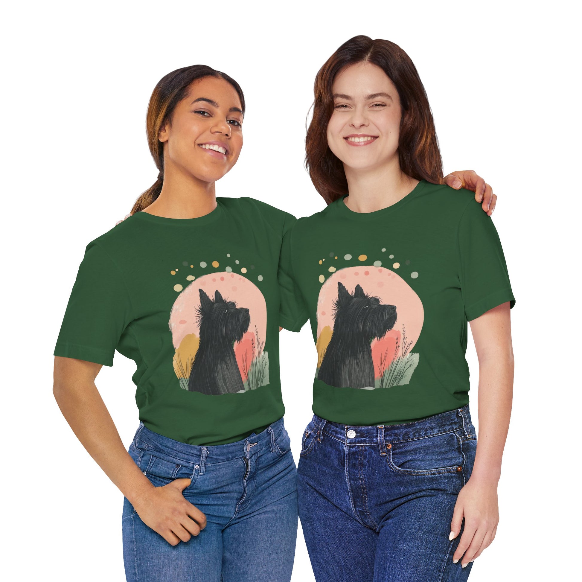 Celebrate the majestic presence of the Briard with this minimalist design, featuring a detailed black silhouette set against a soft watercolor moon and abstract accents. With its clean lines and artistic composition, this unisex t-shirt blends modern style with canine elegance. Perfect for Briard lovers, dog enthusiasts, or anyone who enjoys bold yet minimalist artwork, this tee is a versatile staple that pairs effortlessly with any outfit.